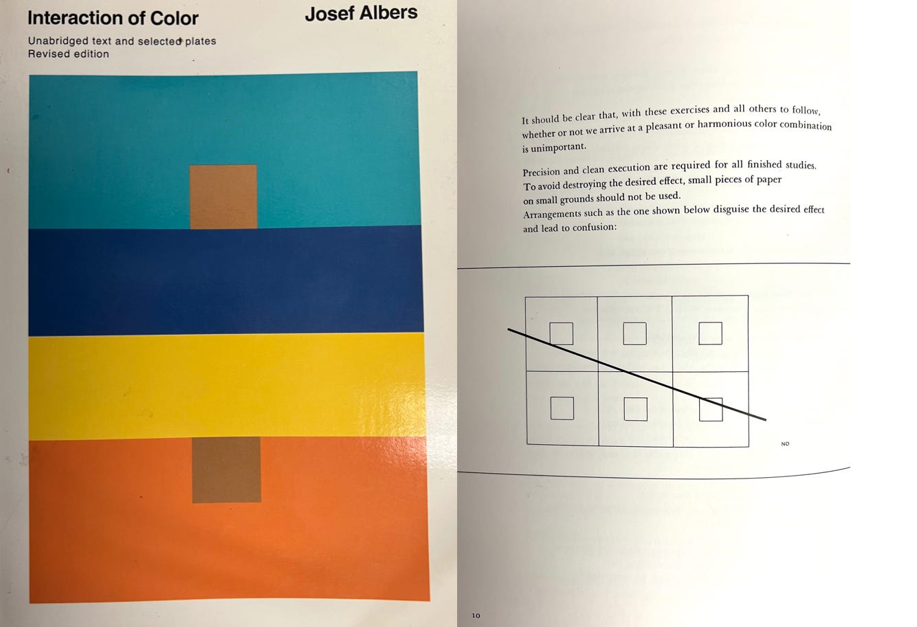 The more I read the two color theory books, the more I felt I was learning mostly from Albers. Because I read the books side by side, I began to recognize where the books overlapped but also departed. I began to hear that Albers was not only talking to us but also offering a direct criticism of both Itten’s book and Itten’s approach to teaching. Specifically, Albers was pushing back on the design of Itten’s book (that’s why all of the obsessive asides about typeface and book layout that pop up in his texts) and pushing back on Itten’s willingness to wade into conjecture.
