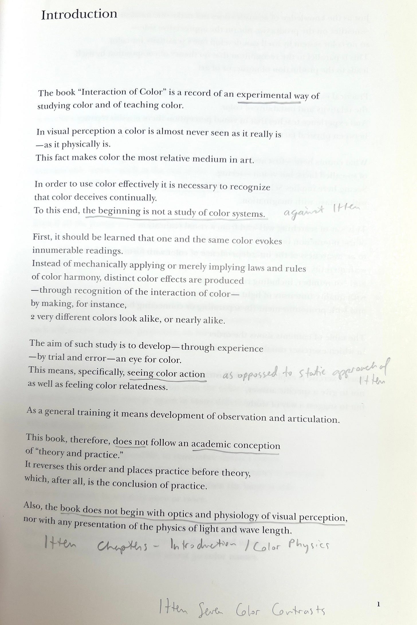 There are numerous examples where Albers is talking about either Itten’s philosophy or about Itten’s book design. Consider the table of contents of The Art of Color. It begins where Albers says not to begin. See my underlined notes at the bottom of this page.