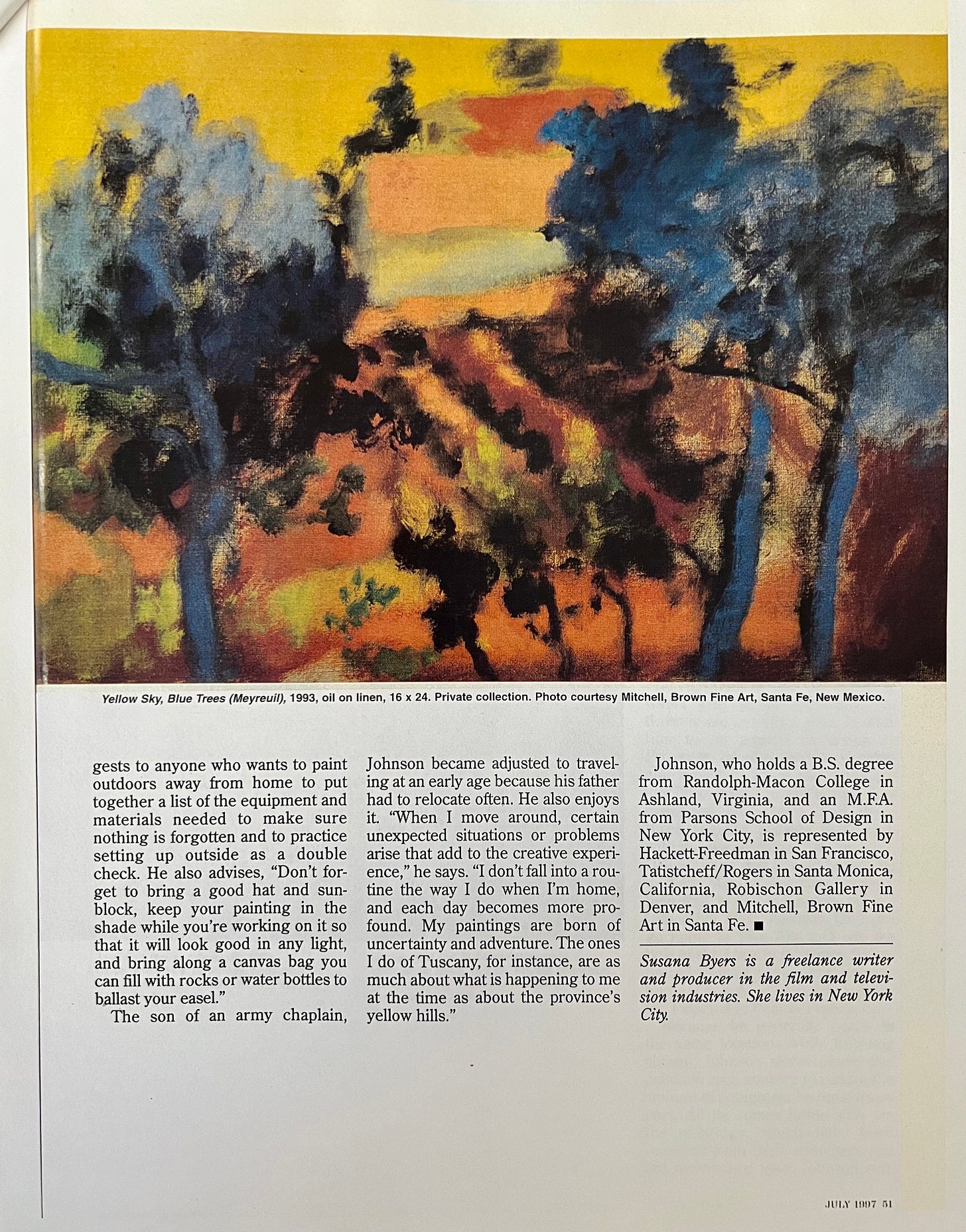 Johnson took his first painting trip to France--to a small town in Provence -while still a student at Parsons. He was struck by the light and scenery there, but when he began painting, he quickly became frustrated because he was unable to capture the colors. “The local people who saw my early work criticized me for making the paintings too dark and pointed out that I wasn’t catching the sharp, southern light,” he recalls.